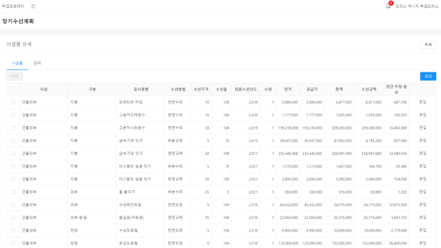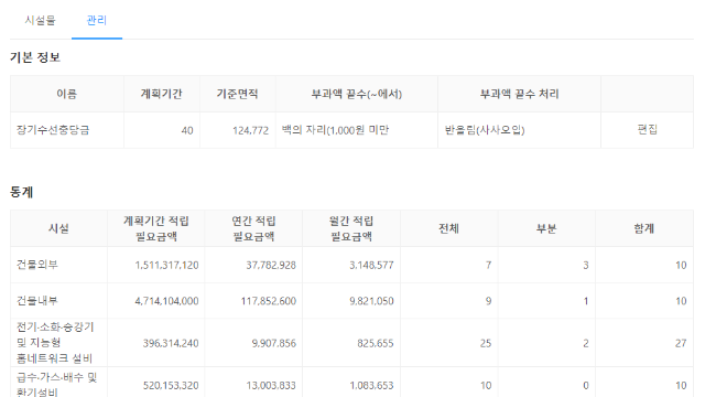 유닛클 ERP 시설관리건물의 장수명화를 위하여 주요 시설물을수리 · 교체하는데 필요한 금액 관리하세요. 레이브 플랜 보기 자유도 높은 설정이 가능한 시설관리 고지서 연동을 이용하여 간편하게 관리하세요! 시설물관리시설물 구분 시설물 관리 시설물 등록 장기수선계획장기수선계획 수립 적립요율, 계획 기간 등 설정 관리비/임대차 고지서 연동 시설관리 시설물관리 건물을 더 안전하고 오래 쓸 수 있도록시설물 수리/교체에 필요한 금액 관리! 시설물 구분 시설물 관리 시설물 등록 시설관리 장기수선계획 시행 규칙에 따라 건물 내/외부의주요시설물 수선계획 관리! 장기수선계획 수립 적립요율, 계획 기간 등 설정 관리비/임대차 고지서 연동 유닛클 ERP에 편리함을 더하다! 건물 관리, 관리비 부과, 세무, 임대 관리, 홈케어 각종 제휴 서비스로 복잡한 업무들을 원스톱 해결 연계 서비스 보기
